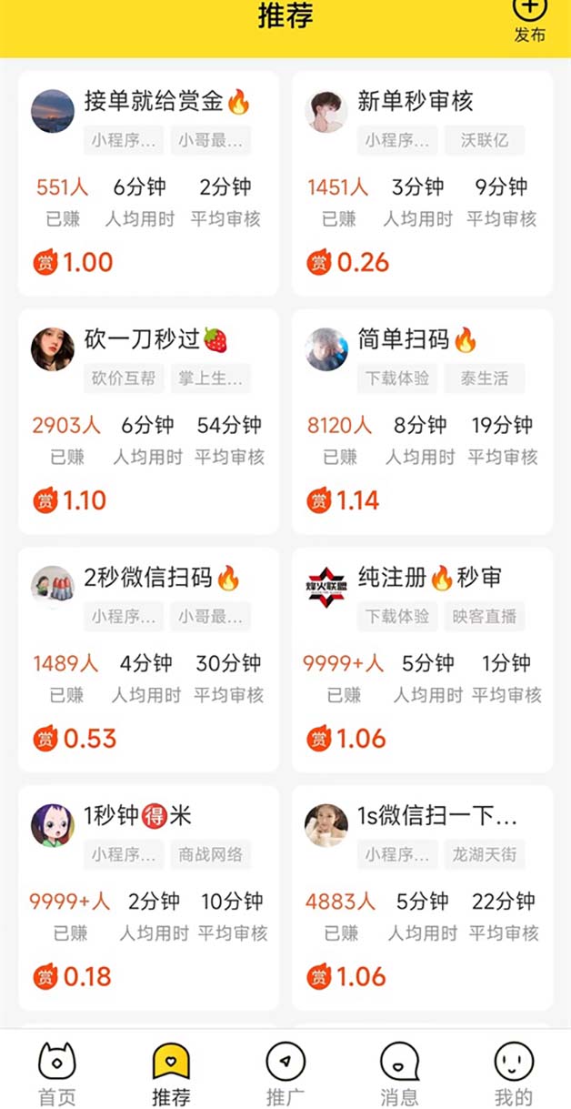 任务类型多元覆盖广:涵盖注册下载、试玩体验、推广引流等数十种悬赏任务,适配碎片化时间需求。